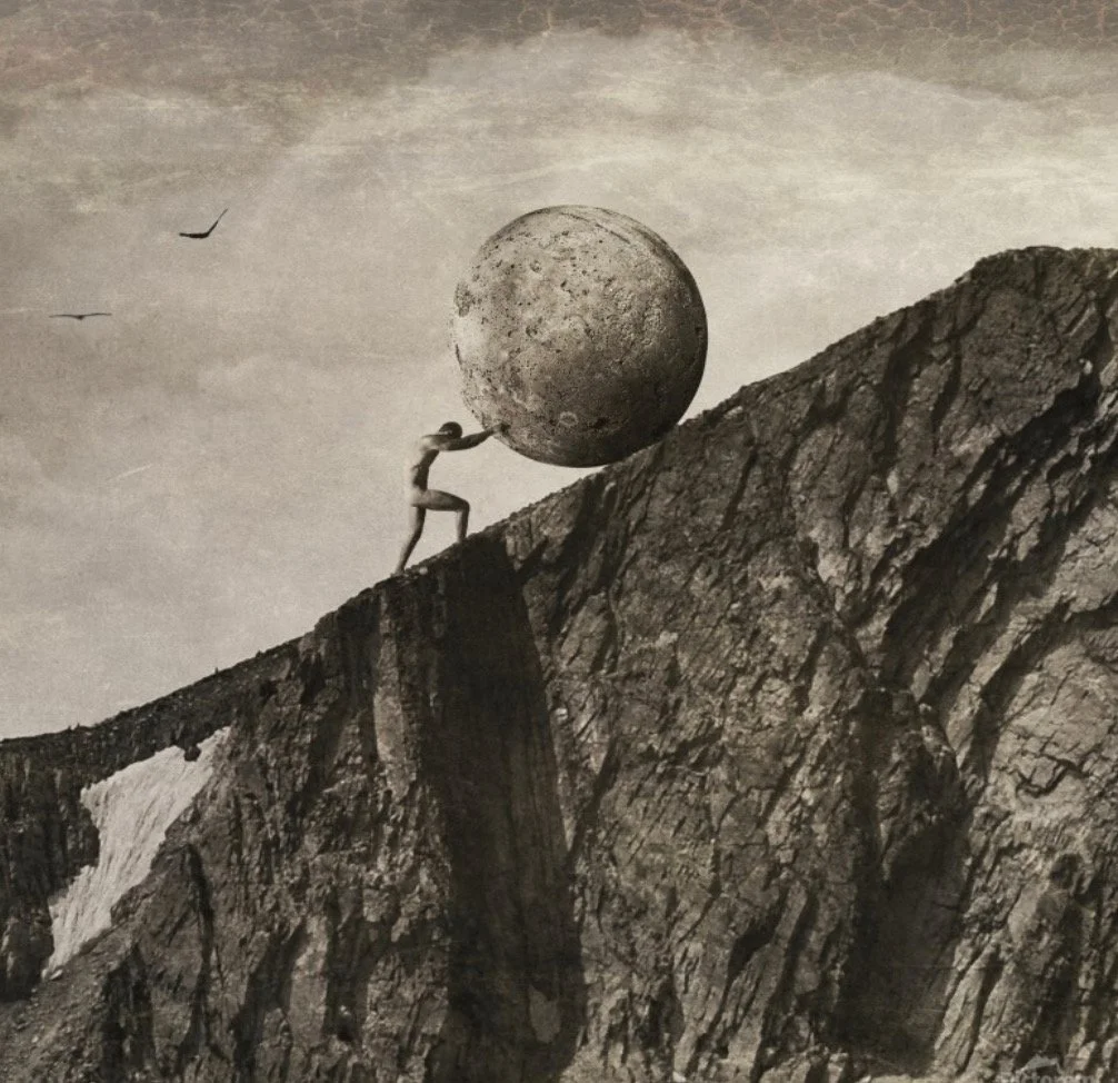 French philosopher and writer Albert Camus, in Myth of Sisyphus, compares the absurdity of a person’s life with the situation of Sisyphus. Condemned to repeat forever the same meaningless task of pushing a boulder up a mountain, only to see it roll down again just as it nears the top. The essay concludes, “The struggle itself towards the heights is enough to fill a man’s heart. One must imagine Sisyphus happy.”