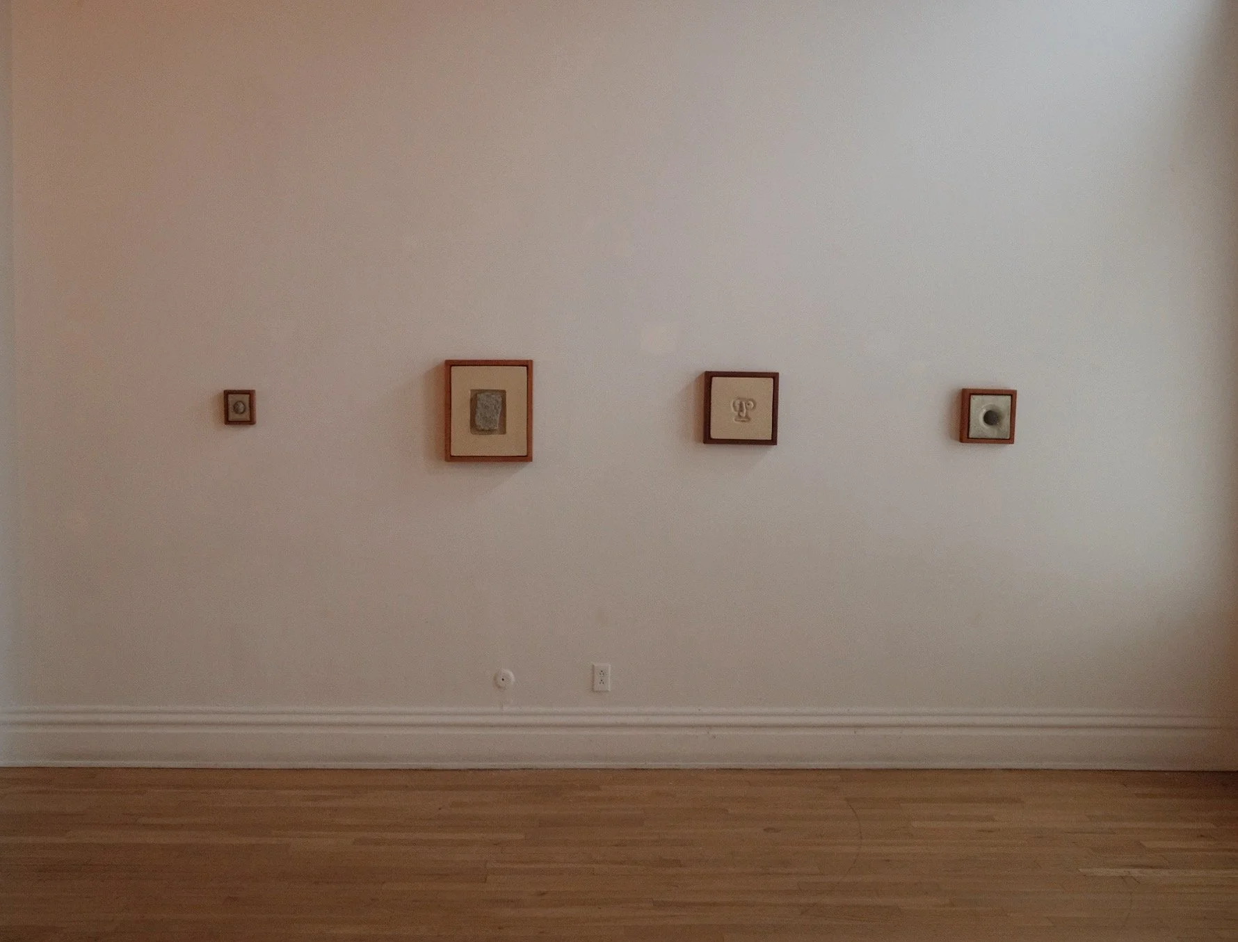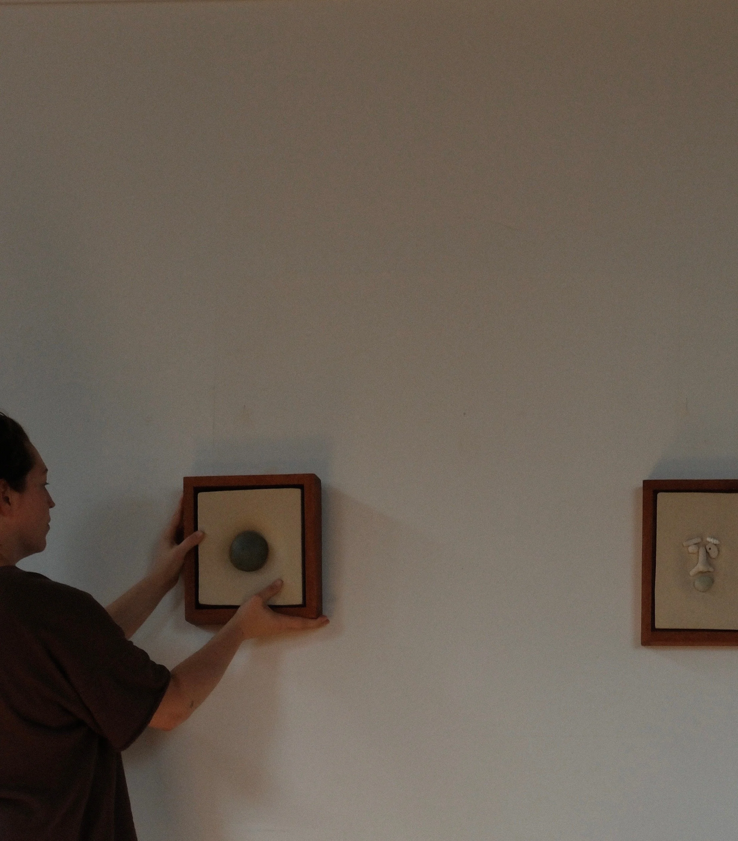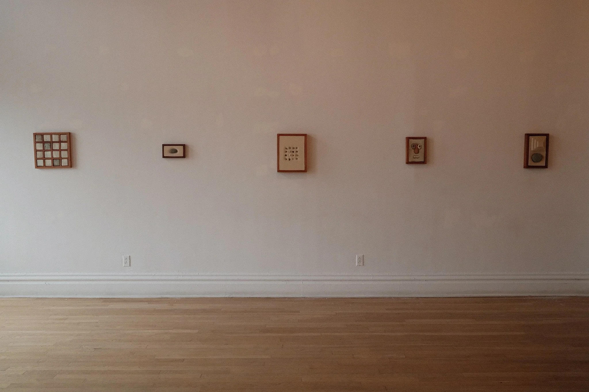 A collection of new works made in ceramic, wood and stone by Elise Birnbaum, framed in mahogany by Aisha Bigwood.