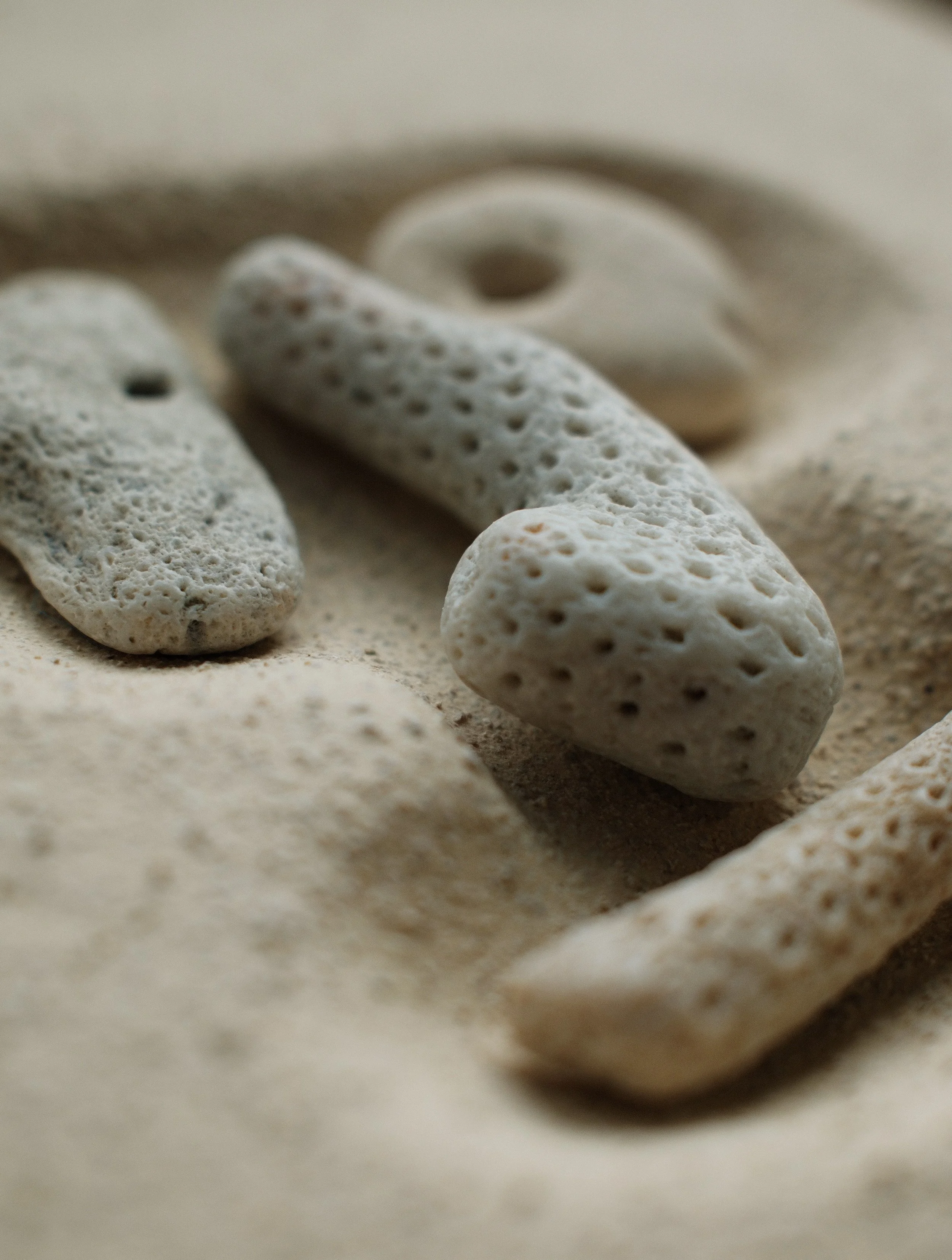 I have been collecting inspiration for years, carrying around rocks or words in my back pocket, waiting for them to spontaneously combust into ideas. I began making pieces with stones and ceramic, both hard, heavy materials that have a optical softness to them. They became the landscapes and visual language I had been searching for.